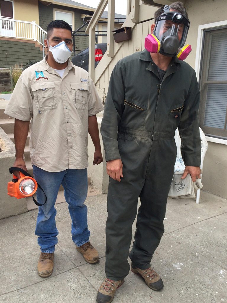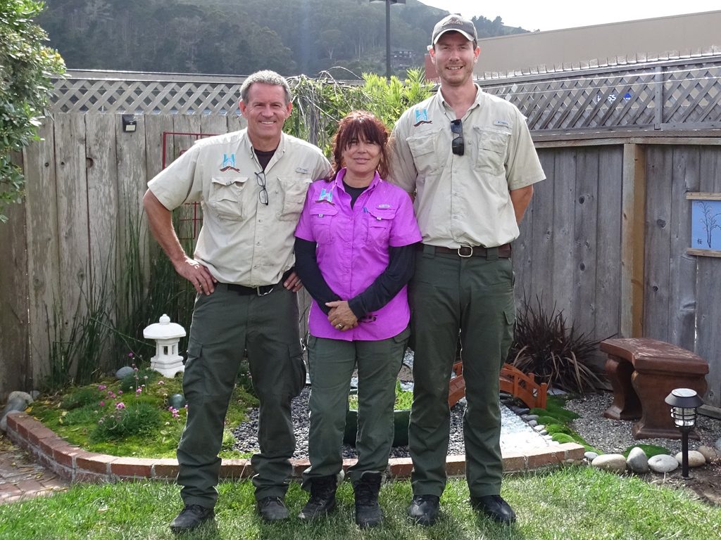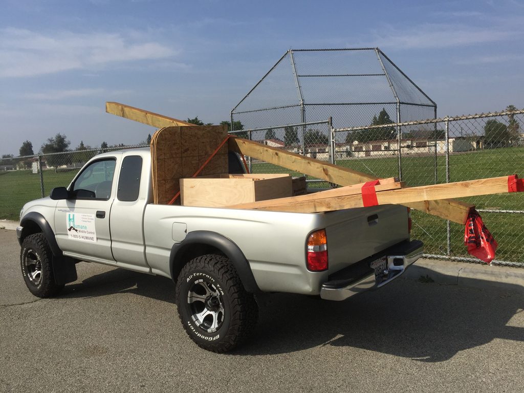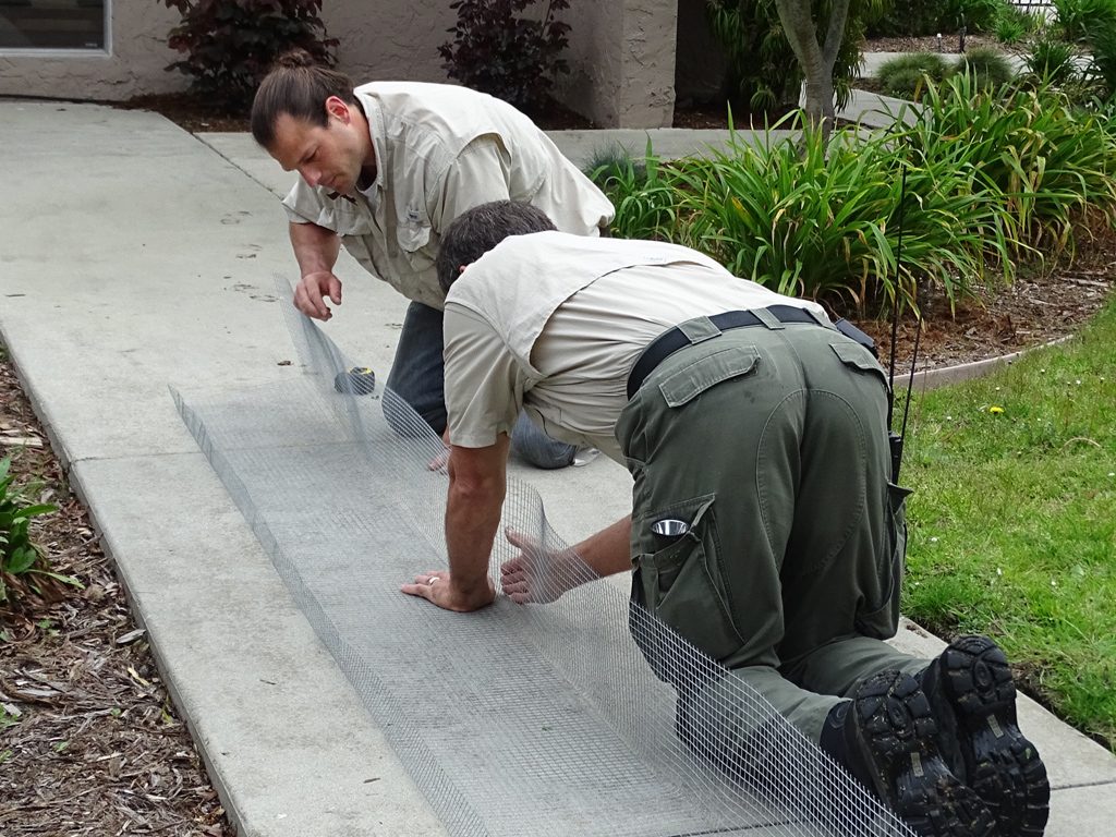 A one-way door for a rat. Pebble Beach. Clearing grass for easier meter access. Monterey. Preventing access under the deck, Pajaro Dunes. Owl boxes ready to go! Owl box being installed at an elementary school. Los Angeles. Screen being installed at an apartment complex. Capitola. Trenching for screen. Installing barn owl boxes at Pajaro Dunes. Barn owl box at Pajaro Dunes. Looking for bats. Carmel. The team after installing an electric border. Half Moon Bay. Raccoons being placed in a reunion box. Santa Cruz. After getting a skunk out of an apartment. San Jose. Suited up and ready to encourage a skunk out from under a house. Monterey. Shoring up a building. Santa Cruz. Custom-painted foundation screen. Pacific Grove. Bat exclusion on a log home. Monterey. New custom crawl space door. Preventing raccoons from getting back into a column. Los Angeles. Screening off a deck to prevent intrusion. Los Angeles. Bat box installed as part of a colony eviction. Santa Lucia Preserve. After the ducks were captured, they were transported to the shelter. Domestic ducks removed from a city park pond. Santa Cruz. Raccoon latrine. Soquel. Signs of bat intrusion. Salinas. Mother opossum released from an illegally set trap. Aromas. Bird netting. Los Gatos. Solar-electric barrier on a shed to prevent raccoons from accessing it. PERC being used in a paddock to protect horses. Santa Lucia Preserve. Donating time to help remove ground squirrels and gophers. Santa Cruz Arboretum. Mother raccoon moving her cub. Screening off a sea container. Hollister. Evisting a raccoon family from an old Victorian home. Monterey. One of the peacocks captured and taken to the shelter to be adopted. Santa Cruz. Busy building boxes. Aggressive pair of domestic geese, removed and taken to a shelter for adoption. San Jose. Screening off a deck to exclude raccoons. Carmel-by-the-Sea. Barn owl box installed on tree. Santa Lucia Preserve. Opossum removed from a garage. Salinas. Screening off an addition to prevent skunks from taking up residency. Pacific Grove. Burying wire to prevent skunks from digging under. Monterey.